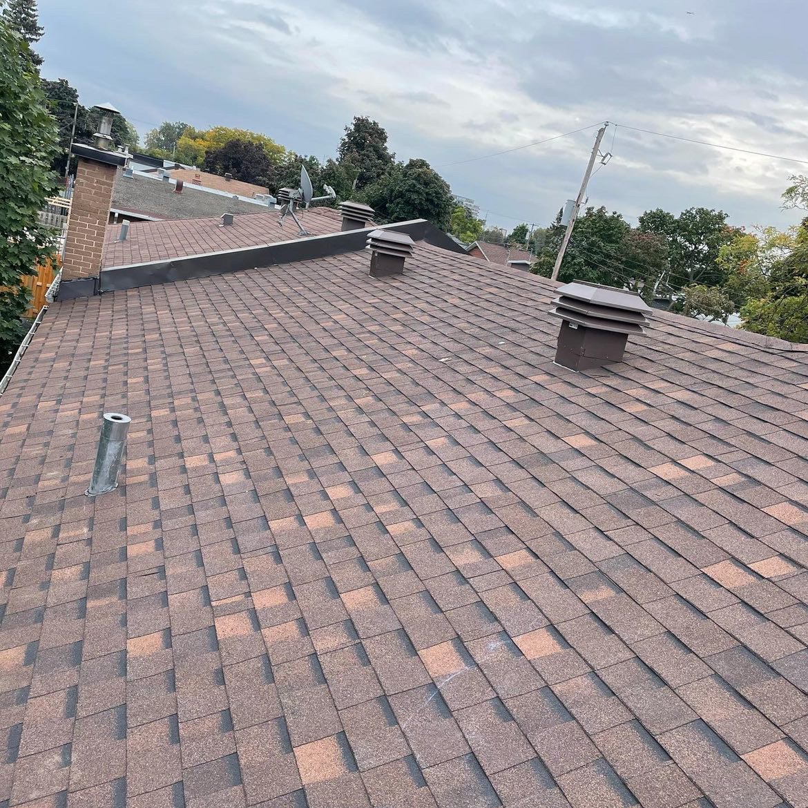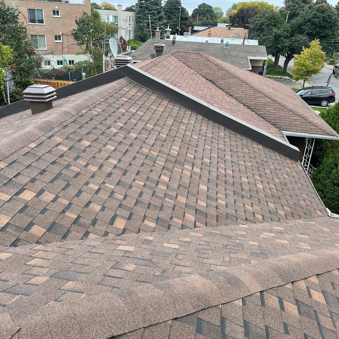 This project involved a comprehensive overhaul of a complex, multi-level roof that was suffering from extreme granule loss, brittle shingles, and compromised ridge caps. Our team performed a complete tear-off down to the decking to ensure structural integrity. We upgraded the property with premium architectural shingles and custom-fabricated metal flashing along the roof transitions to prevent future leaks in high-stress areas. The result is a high-contrast, durable finish that significantly boosts the home’s curb appeal and weather resistance.